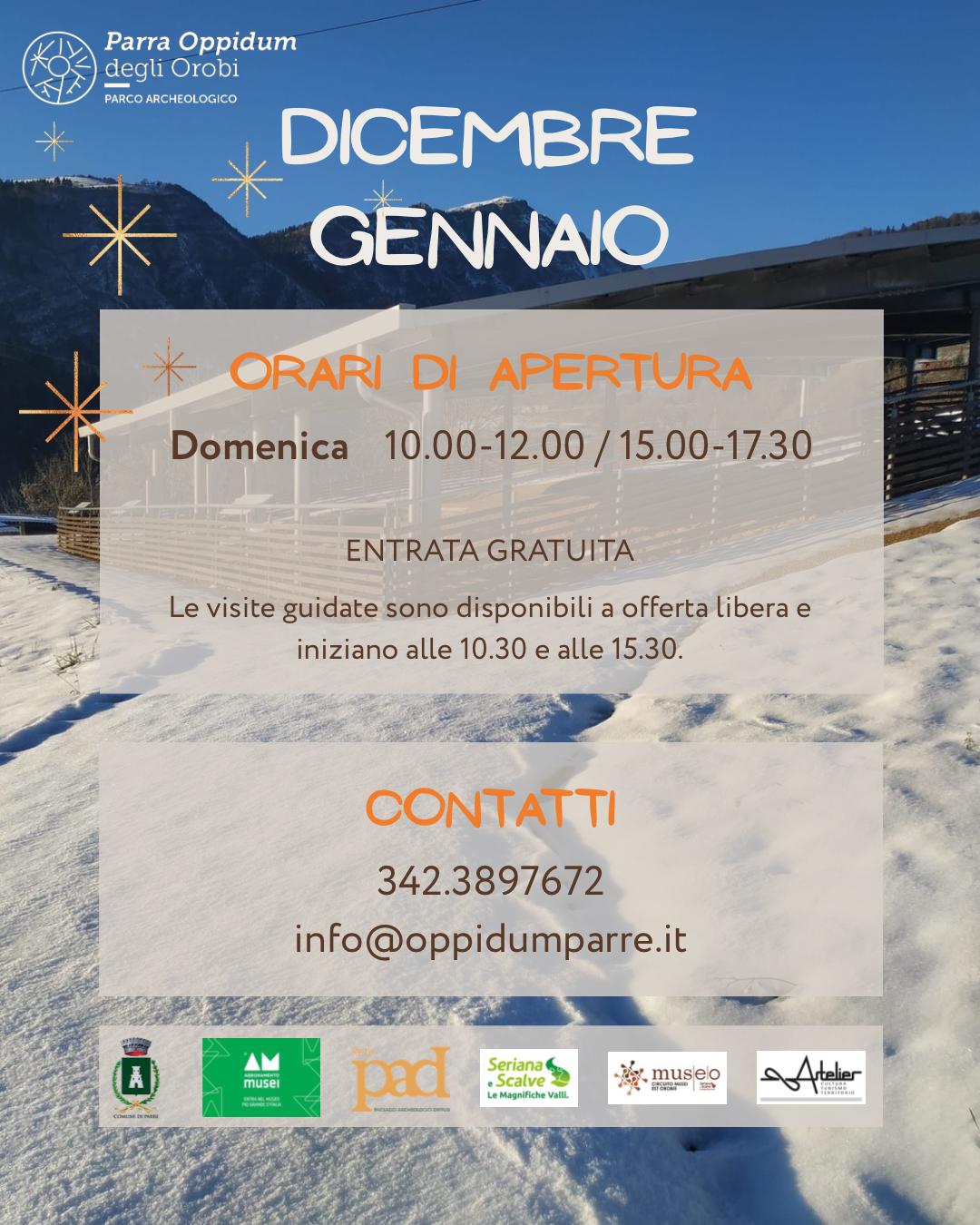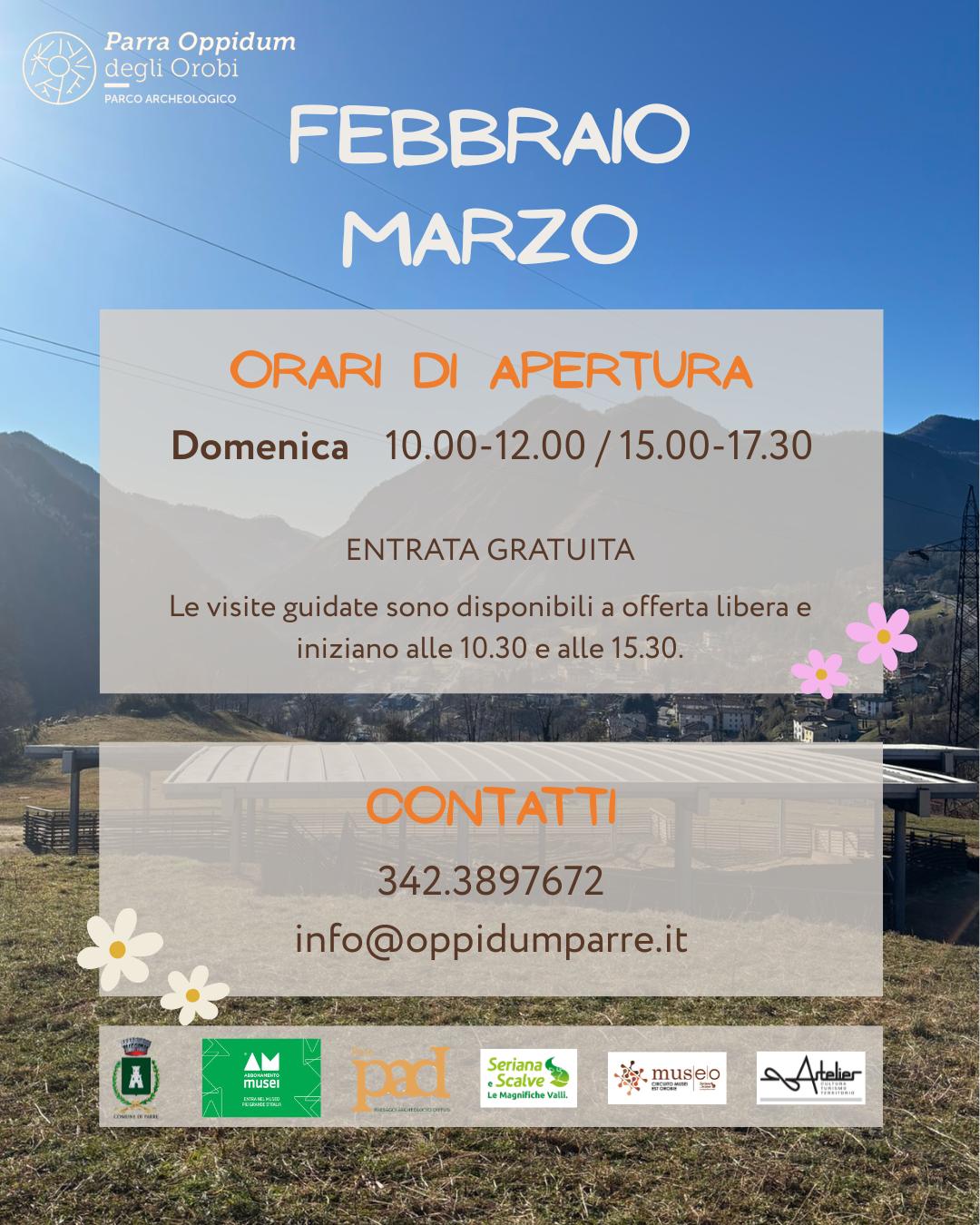 Per i due mesi di febbraio e marzo vengono riconfermate le aperture domenicali sia il mattino che il pomeriggio ed esattamente dalle 10 alle 12 e dalle 15 alle 17,30. L’ingresso all’antiquarium è sempre gratuito mentre per la visita guidata al museo e all’area archeologica, è gradita un’offerta libera utile a sostenere le attività di Parra Oppidum degli Orobi.